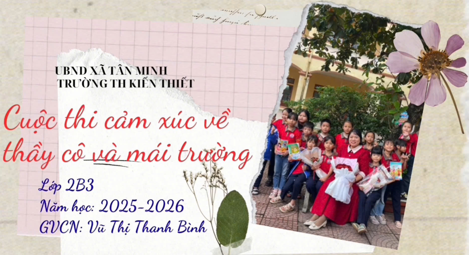 Mùa hiến chương đang nở rộ trên khắp đất nước, tạo ra niềm vui và sự biết ơn sâu sắc cho những người thầy, người cô, những người dành cả cuộc đời để truyền đạt tri thức và hình thành tương lai cho thế hệ trẻ. Ngày hôm nay, tập thể lớp 2B3 chúng con xin được bày tỏ sự biết ơn kính yêu chân thành đến những người thầy người cô của mình, những người dìu dắt chúng em đến bến bờ tri thức. Thầy cô là người dạy chúng con nét chữ đầu tiên, cầm tay uốn từng con chữ. Đó không đơn thuần là dạy con biết nét chữ. Nét người của con cũng bắt nguồn từ đây. Chúng con cảm thấy tự hào và biết ơn khi được sống và học tập dưới mái nhà chung mang tên trường Tiểu học Kiến Thiết và ngôi nhà riêng mang tên lớp 2B3. Cuối cùng cho tập thể lớp 2B3 chúng con gửi chút tình cảm đặc biệt đến cô giáo chủ nhiệm Vũ Thị Thanh Bình. "Triệu hạt mưa không hạt mưa nào rơi nhầm chỗ, người ta gặp không ai là ngẫu nhiên". Chúng con cảm thấy mình thật may mắn khi được học với cô. Cảm ơn cô đã tận tình chăm sóc chỉ bảo dạy dỗ chúng con. Cô cho chúng con những bài học hay, kỷ niệm, ký ức đẹp. Thầy cô là ngọn đèn soi sáng, là ngọn lửa sưởi ấm cuộc đời chúng con. Chúng con mãi mãi yêu quý cô! Lời cuối con xin dành tặng thầy cô bài thơ: