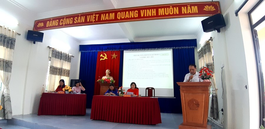 hay mặt Công đoàn, đồng chí Bùi Văn Gắng- Chủ tịch Công đoàn đã báo cáo tổng kết phong trào thi đua năm học 2022 - 2023; nội dung xét khen thưởng và dự kiến phong trào thi đua năm học 2023 - 2024.
