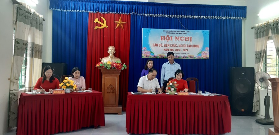 Nhân dịp này, Hội nghị cũng đã tuyên dương khen thưởng các đồng chí cán bộ, giáo viên, nhân viên đạt thành tích cao. Để thể hiện sự quyết tâm, đoàn kết thực hiện thành công Nghị quyết Hội nghị năm học mới, đồng chí Đỗ Thị Ngân và đồng chí Bùi Văn Gắng thay mặt cho 2 tổ chức Chính quyền và Công đoàn ký kết giao ước thi đua giữa Công đoàn và Chính quyền. Hội nghị cán bộ, công chức, viên chức năm học 2023 - 2024 của Trường Tiểu học Kiến Thiết đã thành công tốt đẹp.