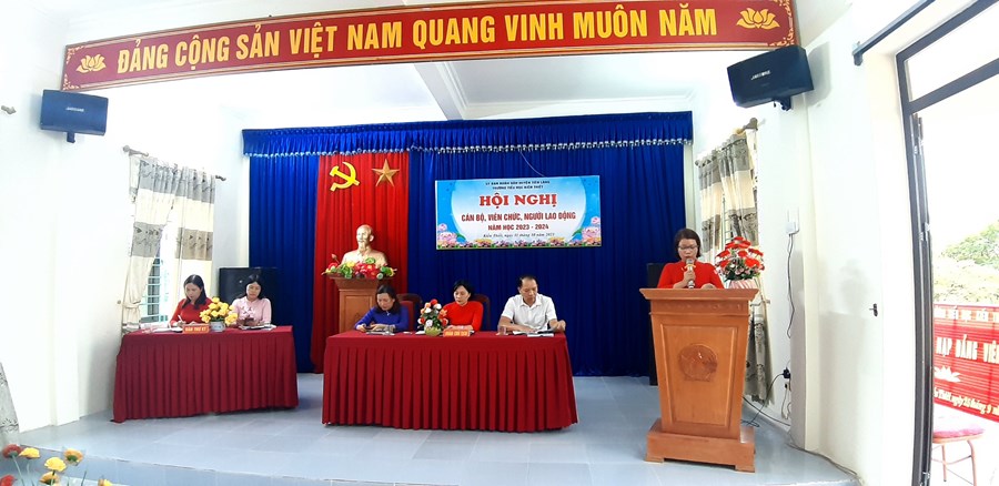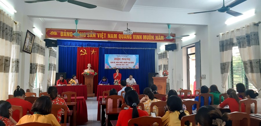 Tại Hội nghị, các văn bản theo quy định đã được thông qua để tập thể đóng góp ý kiến. Mở đầu, đồng chí Bùi Văn Gắng – Chủ tịch Công đoàn nhà trường- thay mặt Đoàn chủ tịch thông qua Báo cáo kiểm điểm thực hiện nghị quyết Hội nghị cán bộ, công chức, viên chức năm học 2022 - 2023; đánh giá kết quả thực hiện nhiệm vụ chính trị của cơ quan, đơn vị và triển khai phương hướng triển khai nhiệm vụ năm học 2023 - 2024. Năm học vừa qua, tập thể cán bộ, giáo viên và các em học sinh, trường đã nỗ lực đạt được những thành tích đáng trân trọng