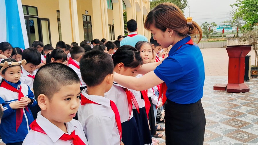 Tia nắng sớm lấp lánh trên những hàng cây quanh sân trường. Trong buổi lễ chào cờ sáng nay, mọi ánh mắt thân thương đều hướng về những học sinh tiêu biểu của khối lớp Ba. Các bạn ấy đang náo nức chờ đón lễ kết nạp Đội.
